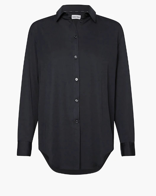 Calvin Kleinin naisten tyylikäs paitapusero, jossa väljä ja kauniisti laskeutuva malli. Puserossa kääntökaulukset, pitkät hihat sekä napitus edessä ja hihansuissa. Puseron pitkä helma on kauniisti pyöristetty. Materiaali miellyttävän tuntuista ja laskeutuvaa kierrätettyä polyesteriä.