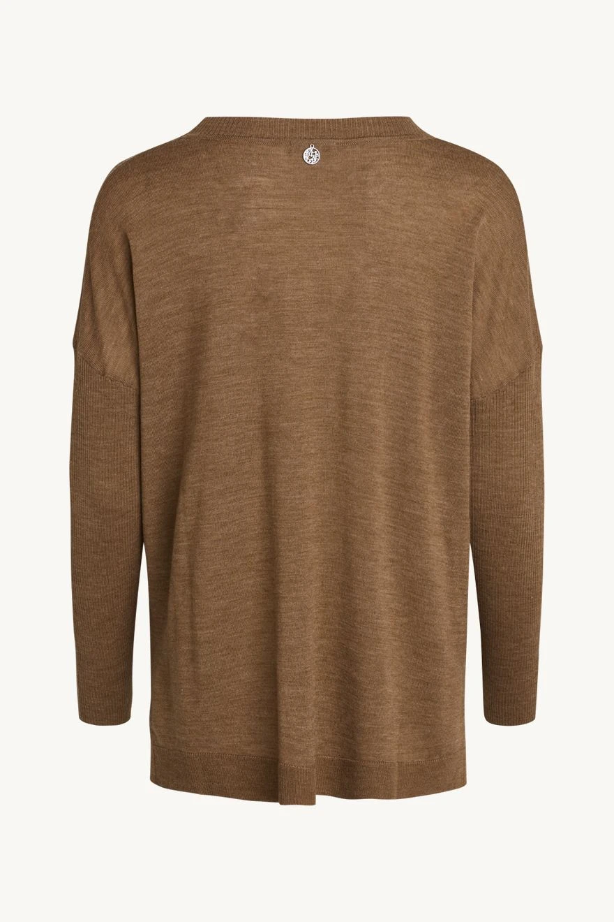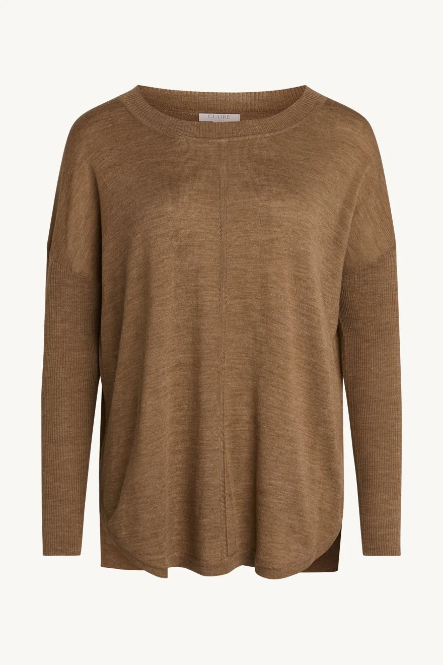 Naisten kaunis, ohut villaneule pyöreällä pääntiellä. Pudotetut olkapäät, kapeat ribbneulos hihat. Pyöristety helma edessä, takana suora. Takana pääntiellä metallinne Clairen logo.
