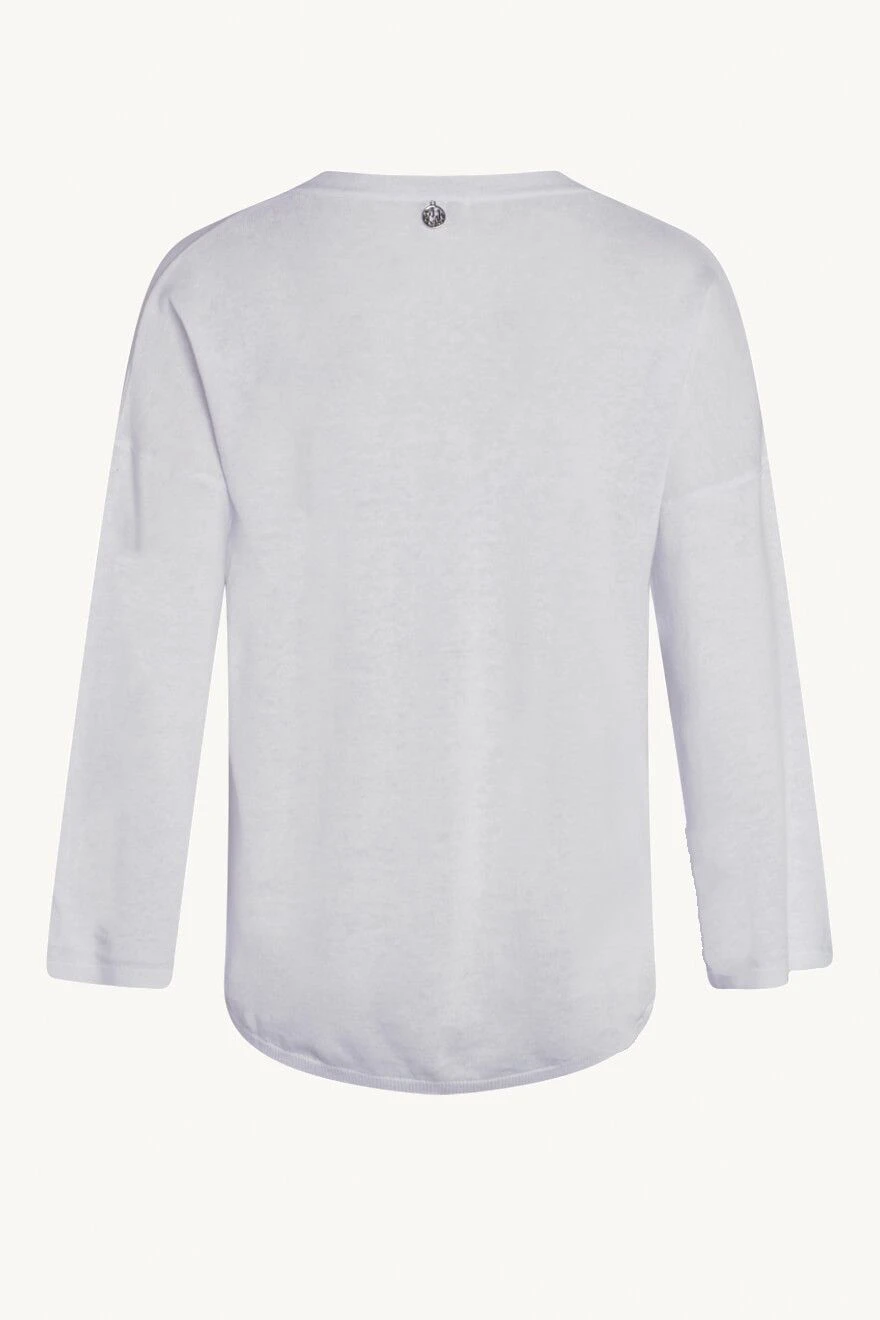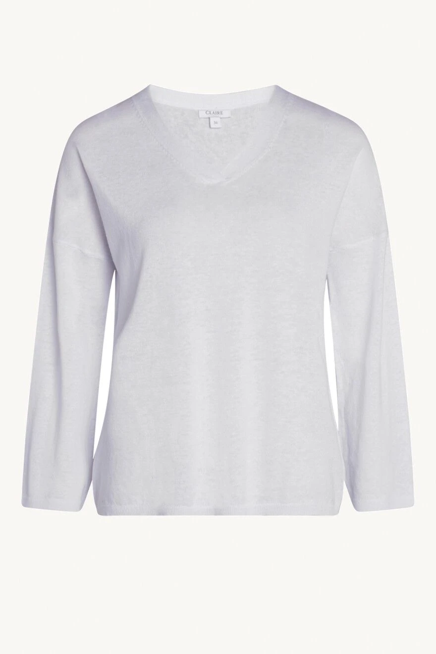 Naisten kevyt ja hengittävä neulepusero, Paula Knit. Mallissa on v-pääntie, trumpettihihat ja takaa hieman pidennetty helma.