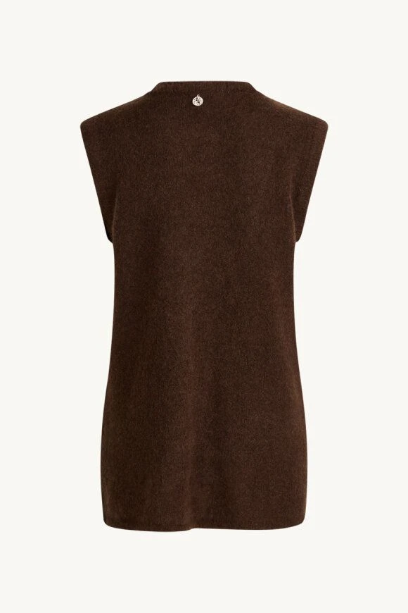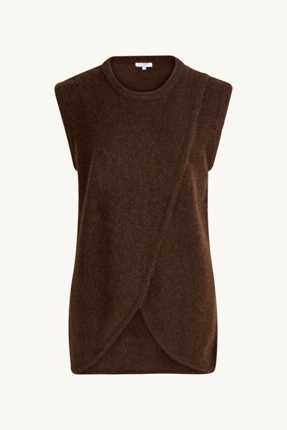 Clairen naisten neuleliivi on ihanan lämpöinen ja päällä pehmeä. Neuleliivin materiaali on korkealaatuista mohair-villa-sekoitetta. Neuleliivi on hihaton ja siin on pyöreä pääntie, jossa joustavaa ribbineulosta. Neuleliivissä on kiinnostava kietaisumalli, jonka etukappaleet asettuvat ristikkäin ja helma jää avoimeksi. Niskassa on pieni kullanvärinen brändin merkki. Ihana neuleliivi toimii kerrostaen mainiosti niin mekkojen kuin puseroidenkin kanssa!