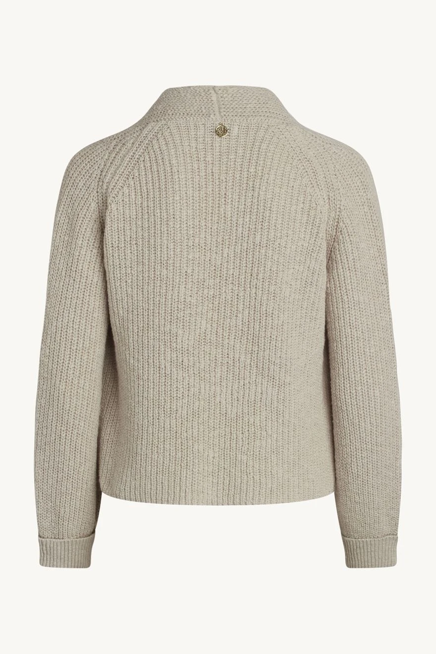 Naisten lyhyt neuletakki, pitkät hihat. Takaa hieman pidempi. Yksi painonappi helmassa. Takan pääntiellä Calire -logolaatta.