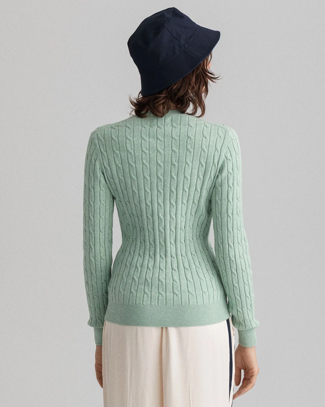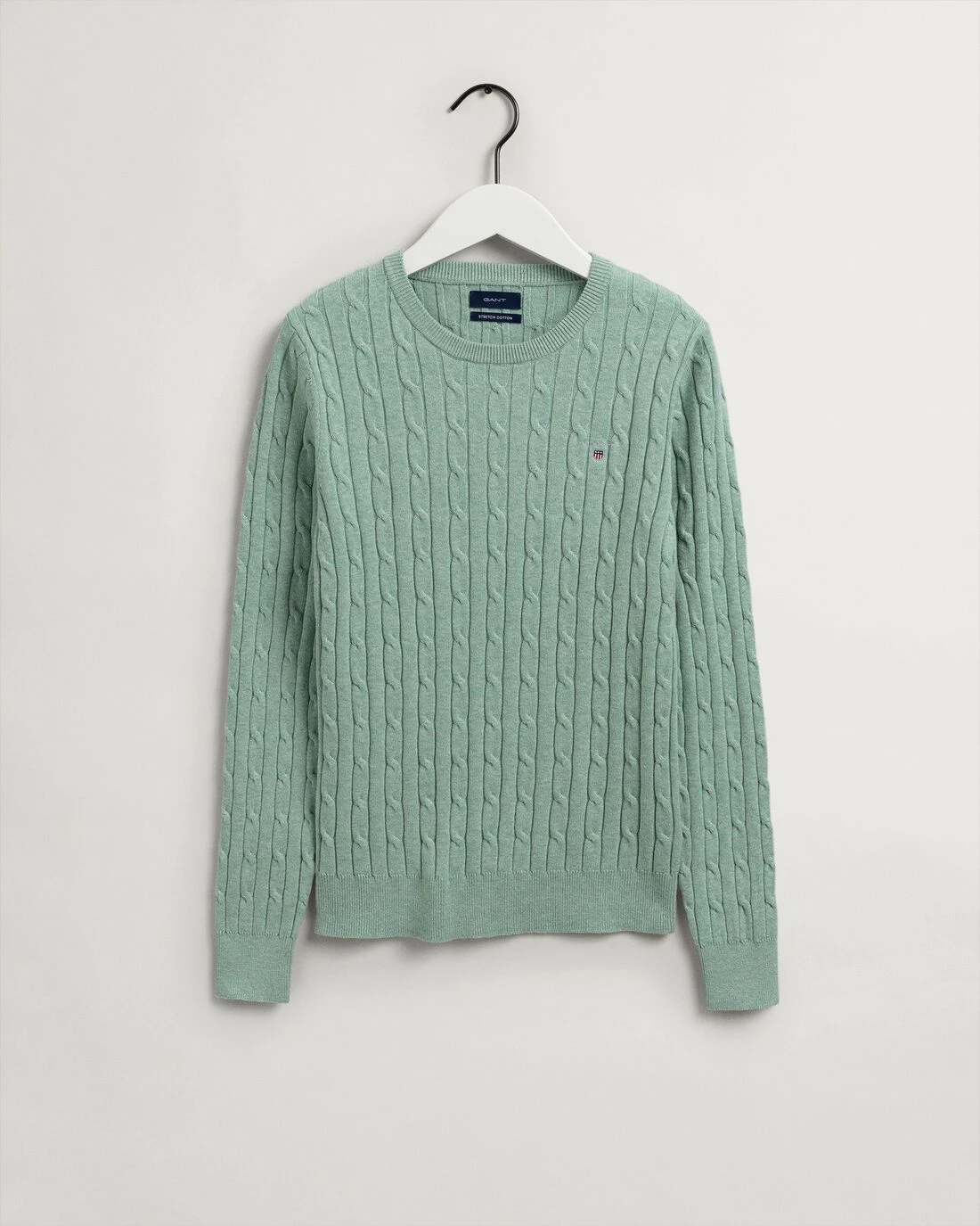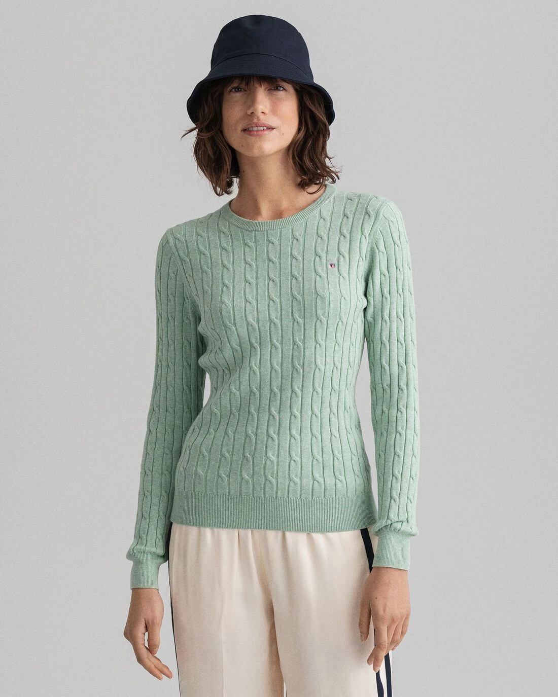 Gant naisten palmikkoneule joustavaa puuvillan ja nailonin sekoitetta. Naisellinen malli, klassinen pyöreä pääntie, helmassa ja hihansuissa resorit, rinnassa perinteinen kirjailtu Gant-vaakunamerkki. Pesu tummat värit erikseen tai samanväristen kanssa, nurinpäin käännettynä.