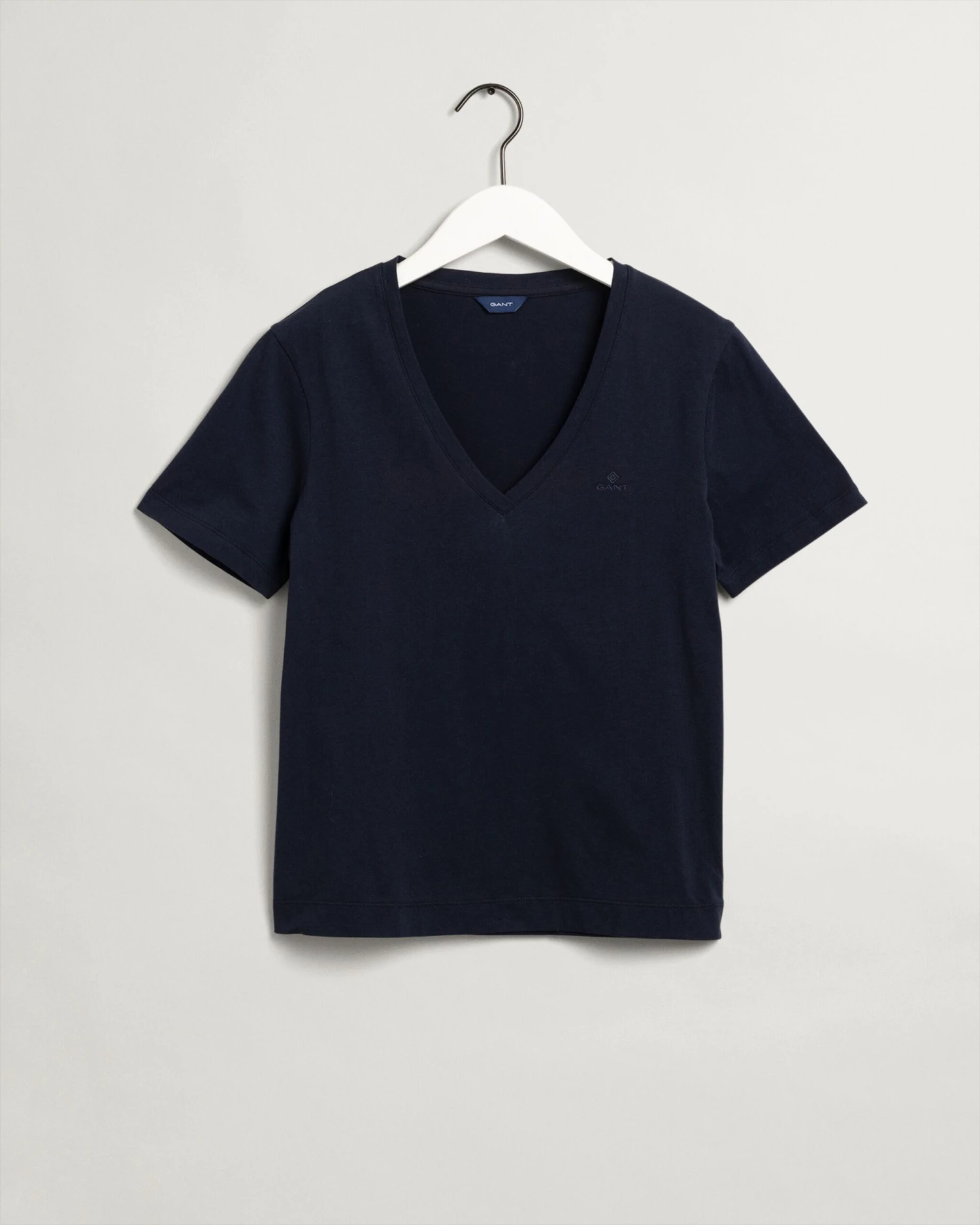 Naisten lyhythihainen t-paita, v-pääntie. Normaali istuvuus. Rinnassa kirjailtu Gant – logo.