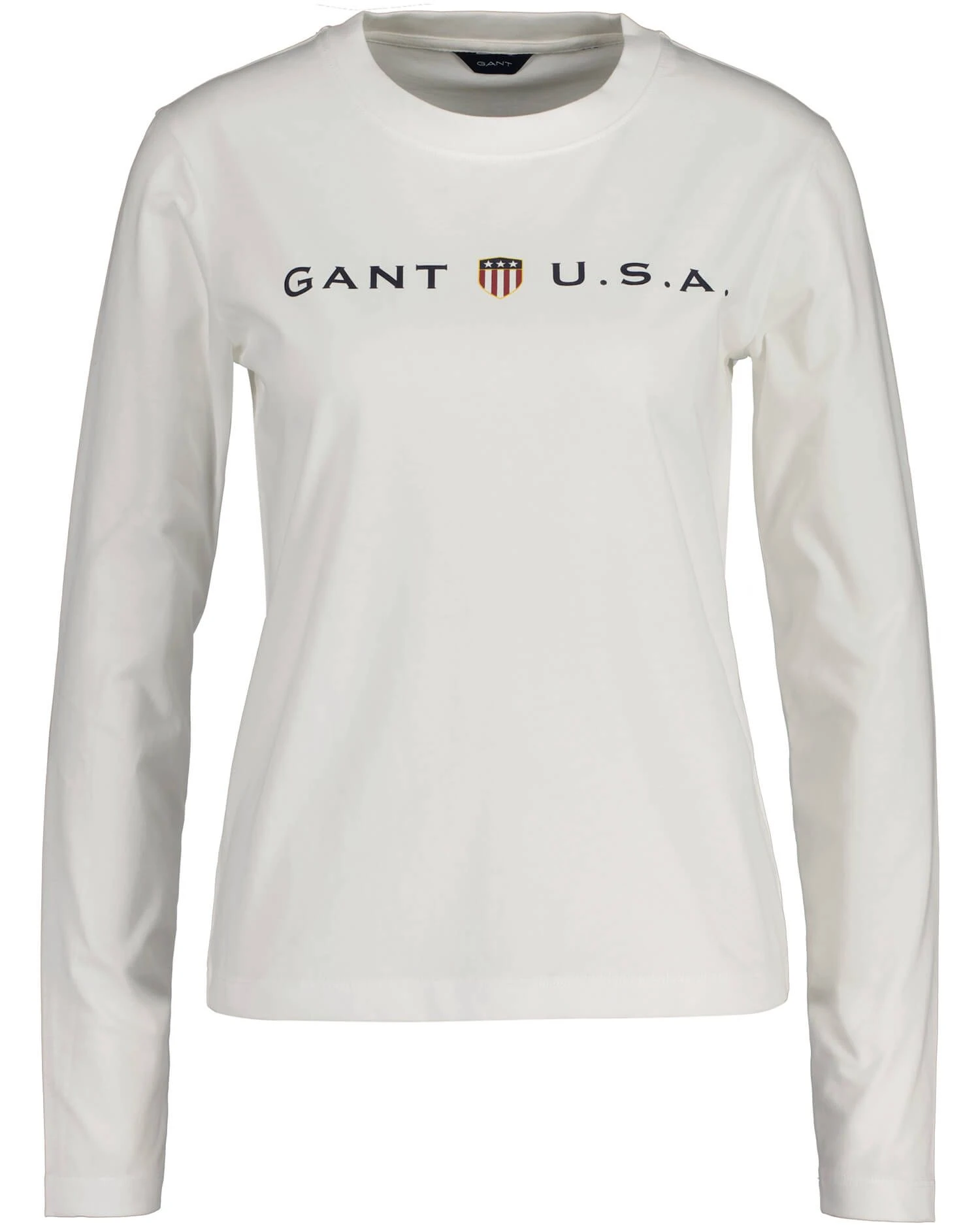 Naisten T-paita, jossa pyöreä pääntie ja pitkät hihat. Rentoa muotoilua hieman lasketuilla hartioilla täydentää kontrastivärinen GANT-logopainatus rinnassa. 100 % korkealaatuinen puuvilla takaa täydellisen hengittävyyden, maksimaalisen käyttömukavuuden ja helpon huollon. Erinomaisesti yhdistettävä ja käytännöllinen vapaa-ajan asu, joka täydentää täydellisesti mitä tahansa urheilullista arkiasuasi.