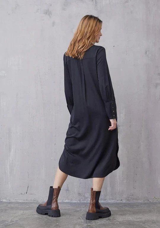 Tämä on rennon tyylikäs Isayn pitkä paitamekko, jonka voi stailata erilaisiin menoihin monella tapaa. Mekossa on läppätaskut rinnassa ja pienet sivuhalkiot helmassa, . Napitus on ylhäältä alas. Materiaali on laskeutuvaa viskoosia ja sen päälle on kiva pukea esim. neule tai neuletakki. Mitoitus on väljä.