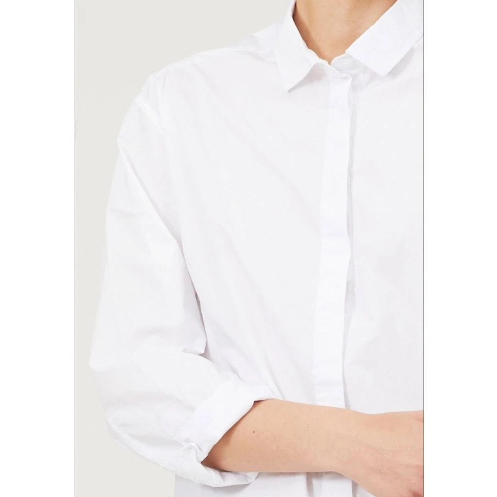 Isayn valkoinen, pitkä paitis. Piiilonapitus, voimakkaasti pyöristetty helma.
