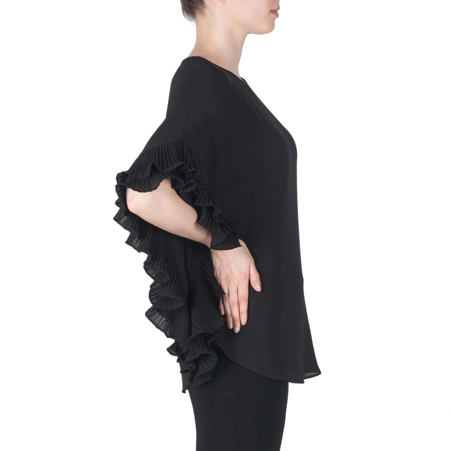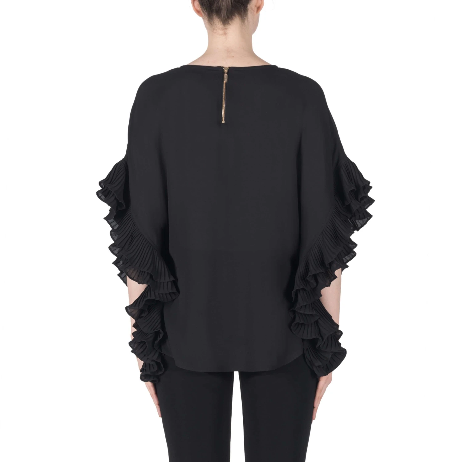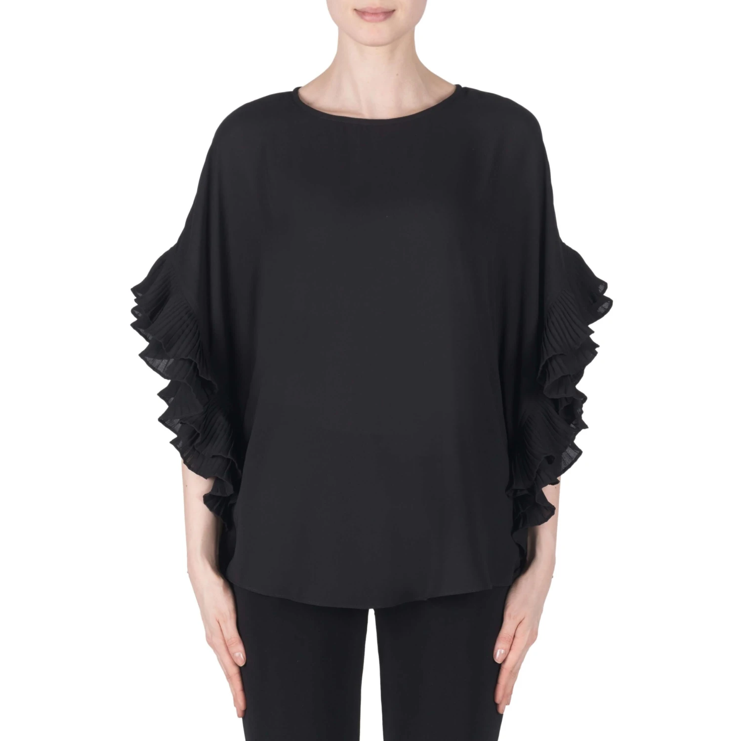 Joseph Ribkoffin kaunis frillapusero. Neliönmallinen, ponchomainen leikkaus, helma hieman pyöristetty. Sivuilla edessä ja takana pliseeratut frillat. Pituus koossa 36 70 cm.