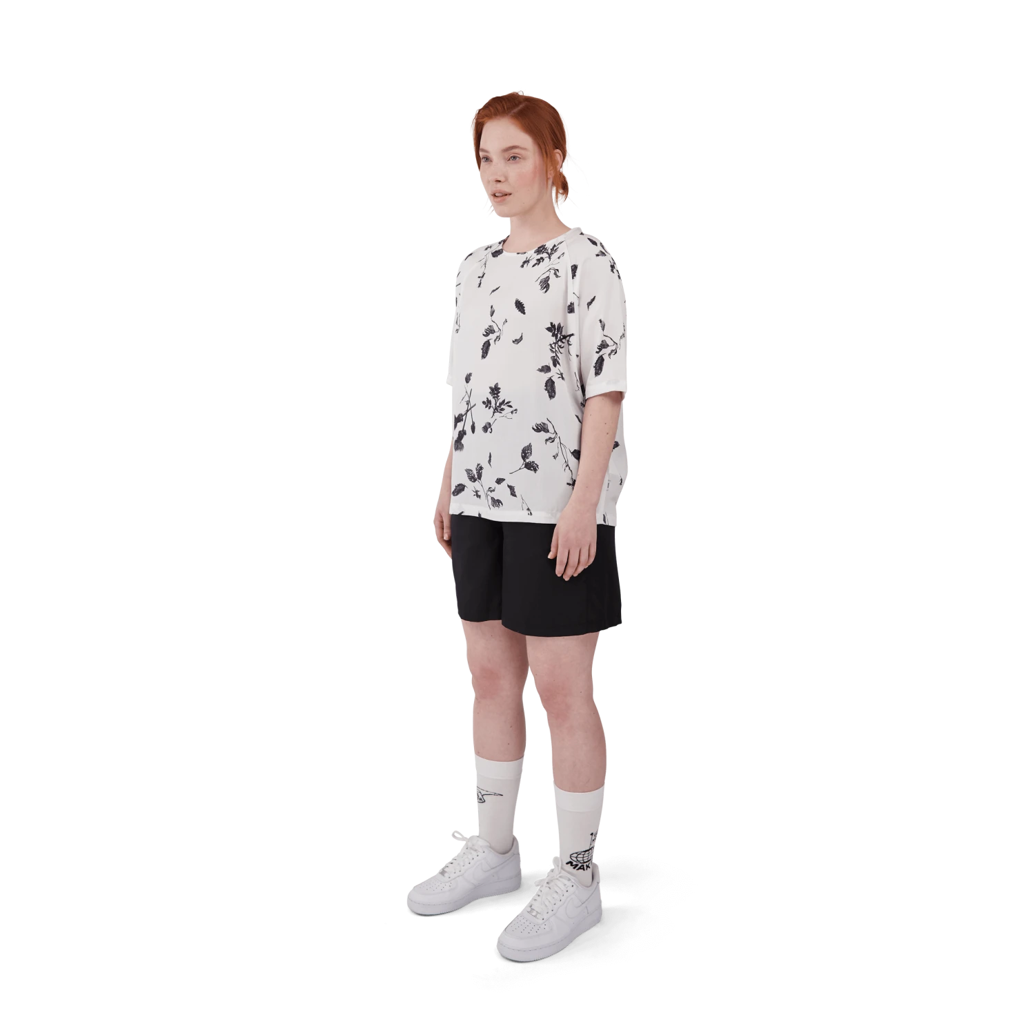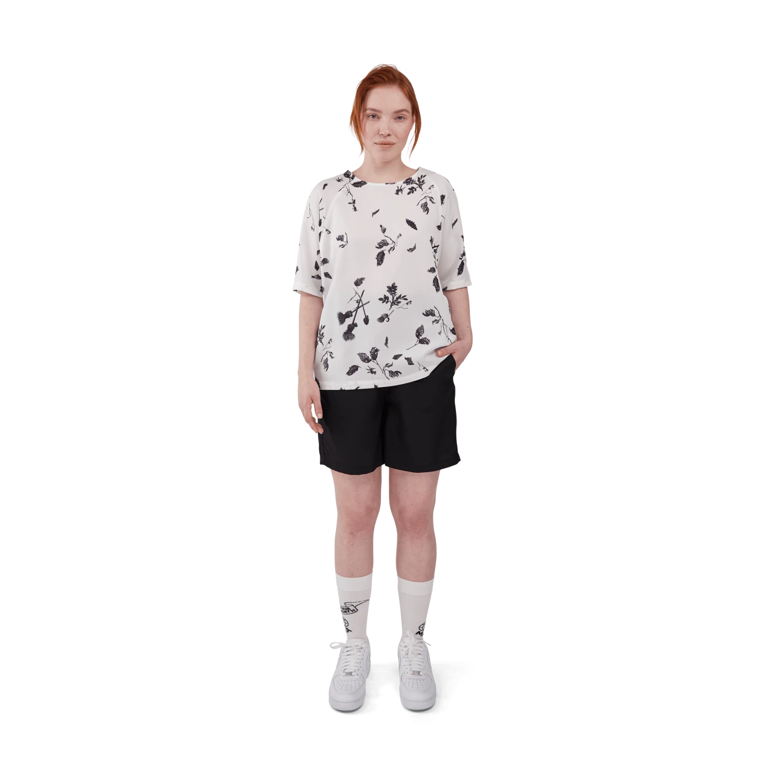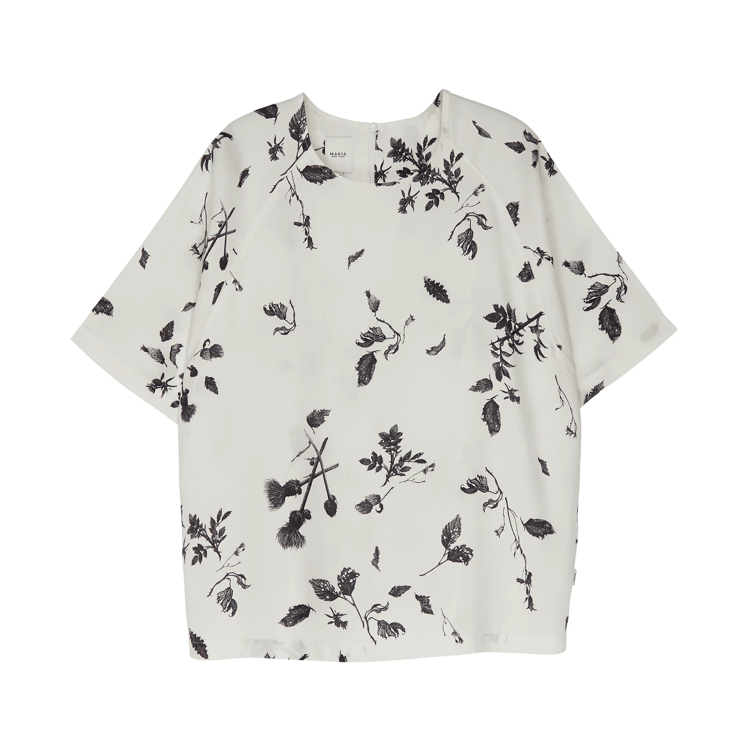 Makia naisten lyhythihainen pusero. Hihat ovat kimono tyyliset raglanhihat. Pusero on istuvuudeltaan rento, joka tekee siitä kesäisen. Takana vetoketju yksityiskohtana.