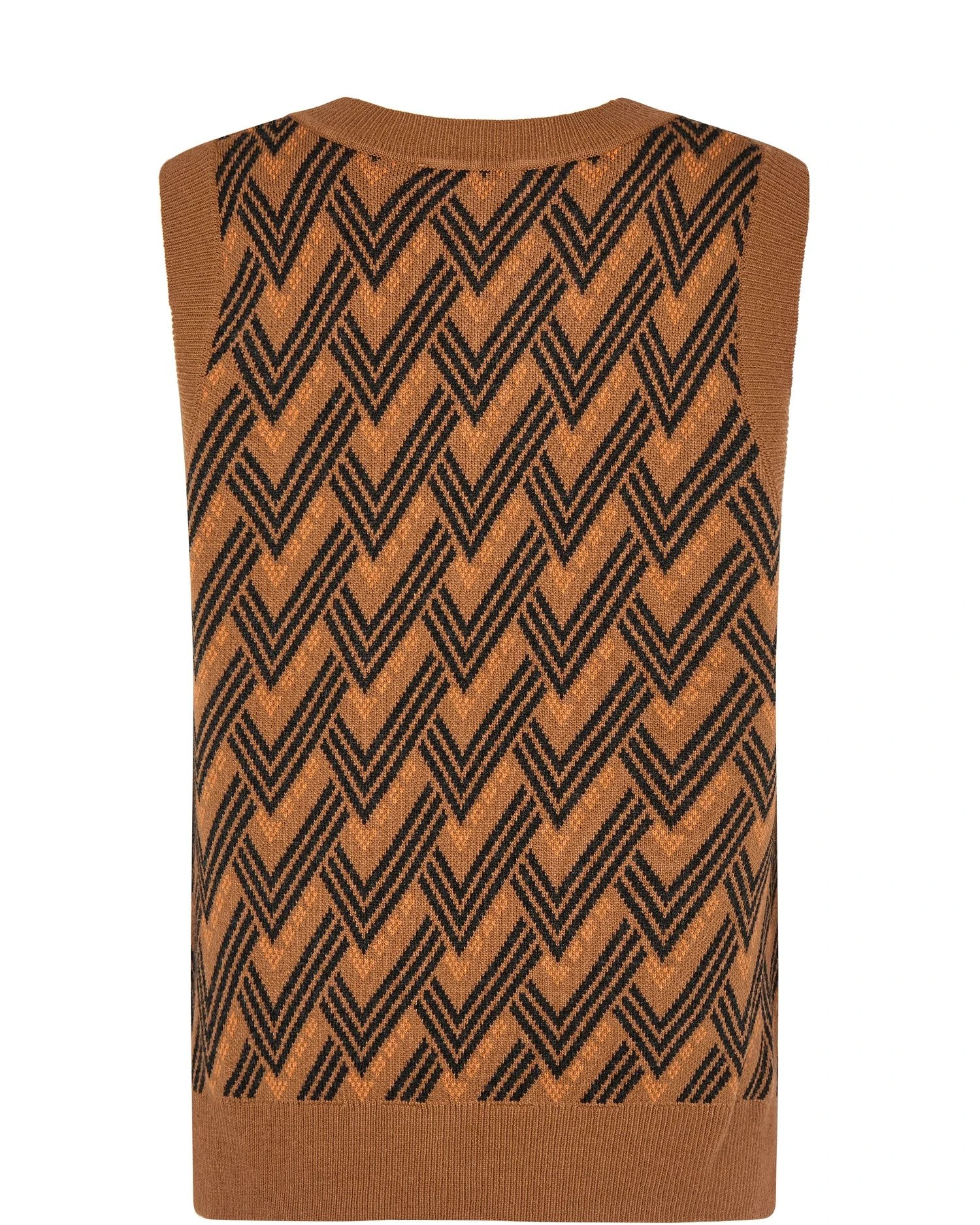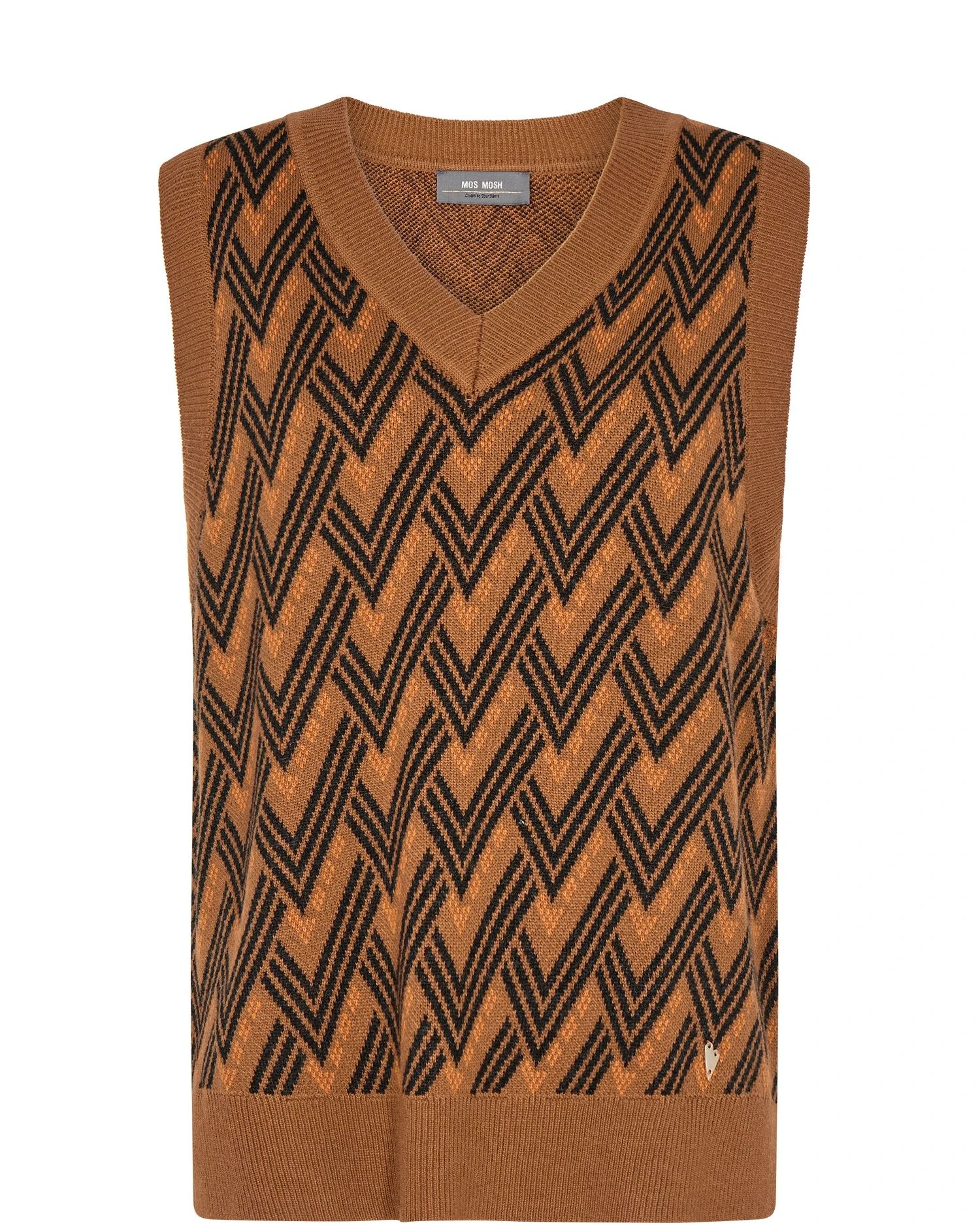 Mos Moshin naisten neuleliivissä on upea retrohenkinen kuosi. Liivissä on v-pääntie, ja pääntiellä, hihansuissa ja helmassa on joustavat resorit. Malli on suoralinjainen, ja laskeutuu rennosti päällä.