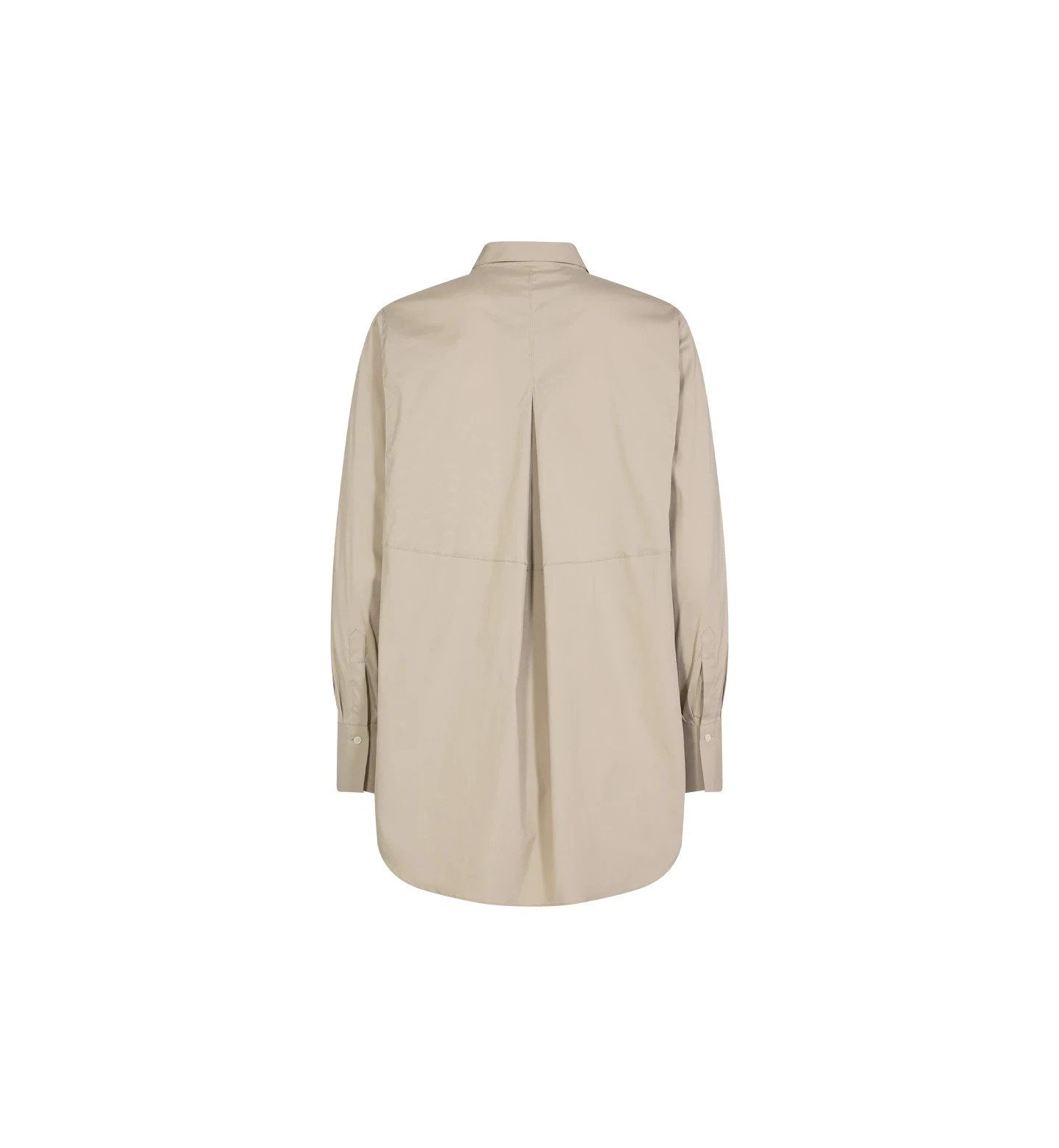 Naisten klassinen paitapusero ylisuurella istuvuudella. Edessä piilonapitus, pyöristetty helma. napilliset, pitkät kalvosimet. Takana selässä leveä vastalaskos.
