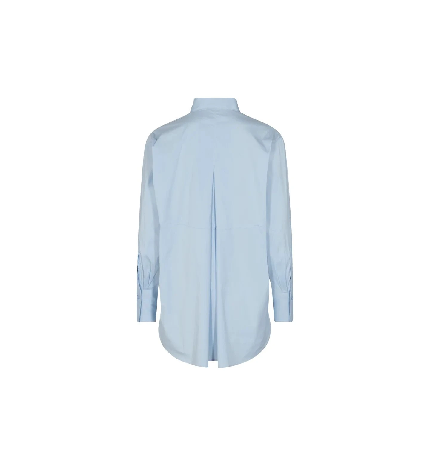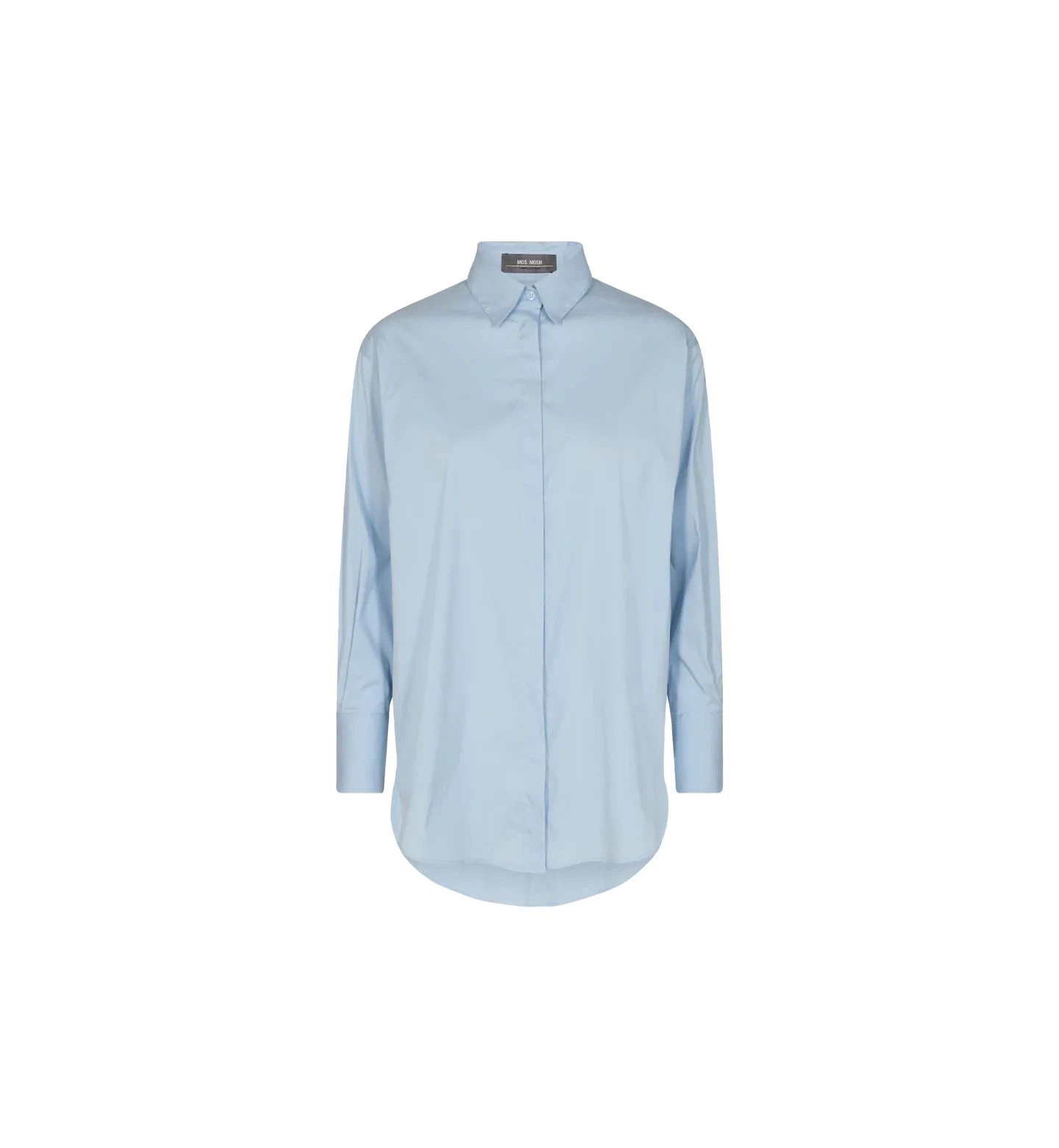 Naisten klassinen paitapusero ylisuurella istuvuudella. Edessä piilonapitus, pyöristetty helma. napilliset, pitkät kalvosimet. Takana selässä leveä vastalaskos.