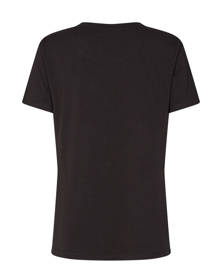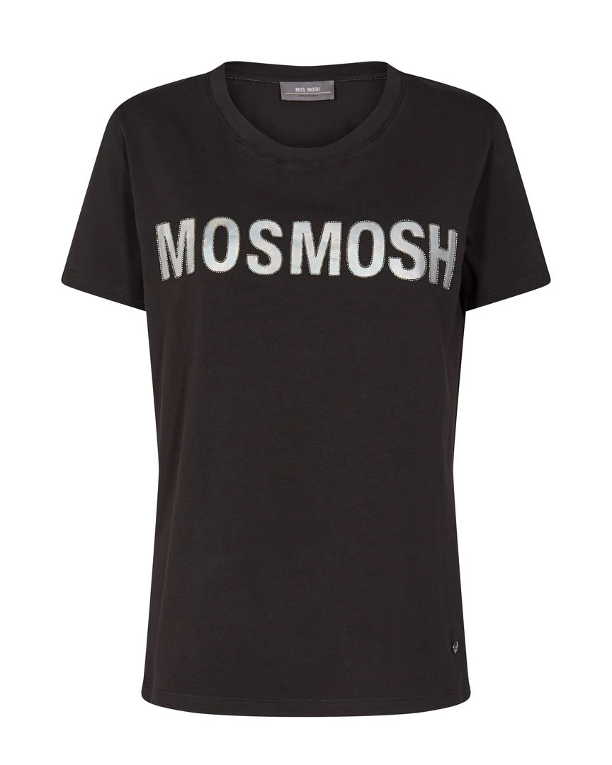 Naisten lyhythihainen t-paita, rinnassa Mos Moshin logokirjaimet, joissa kiiltävät reunat.