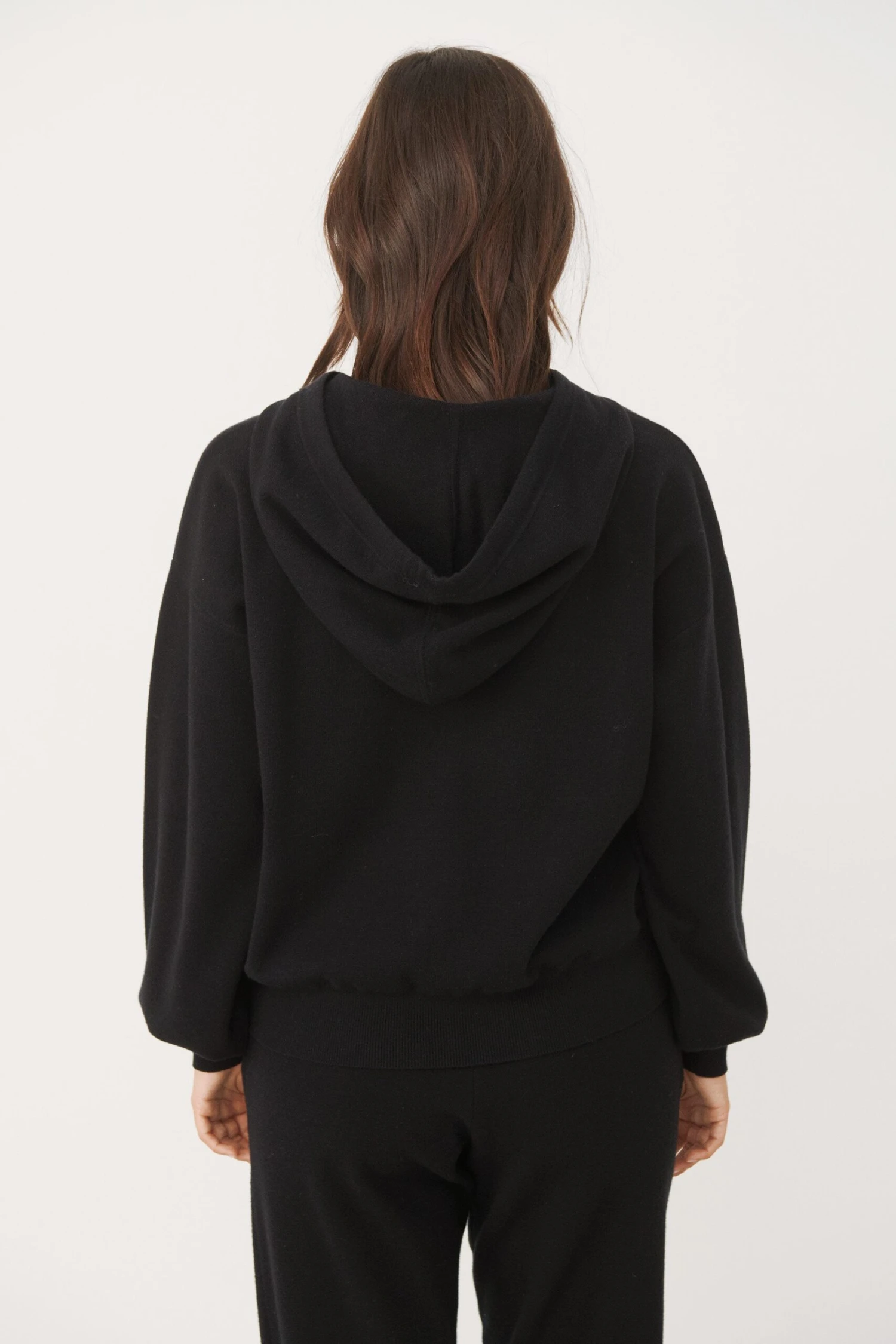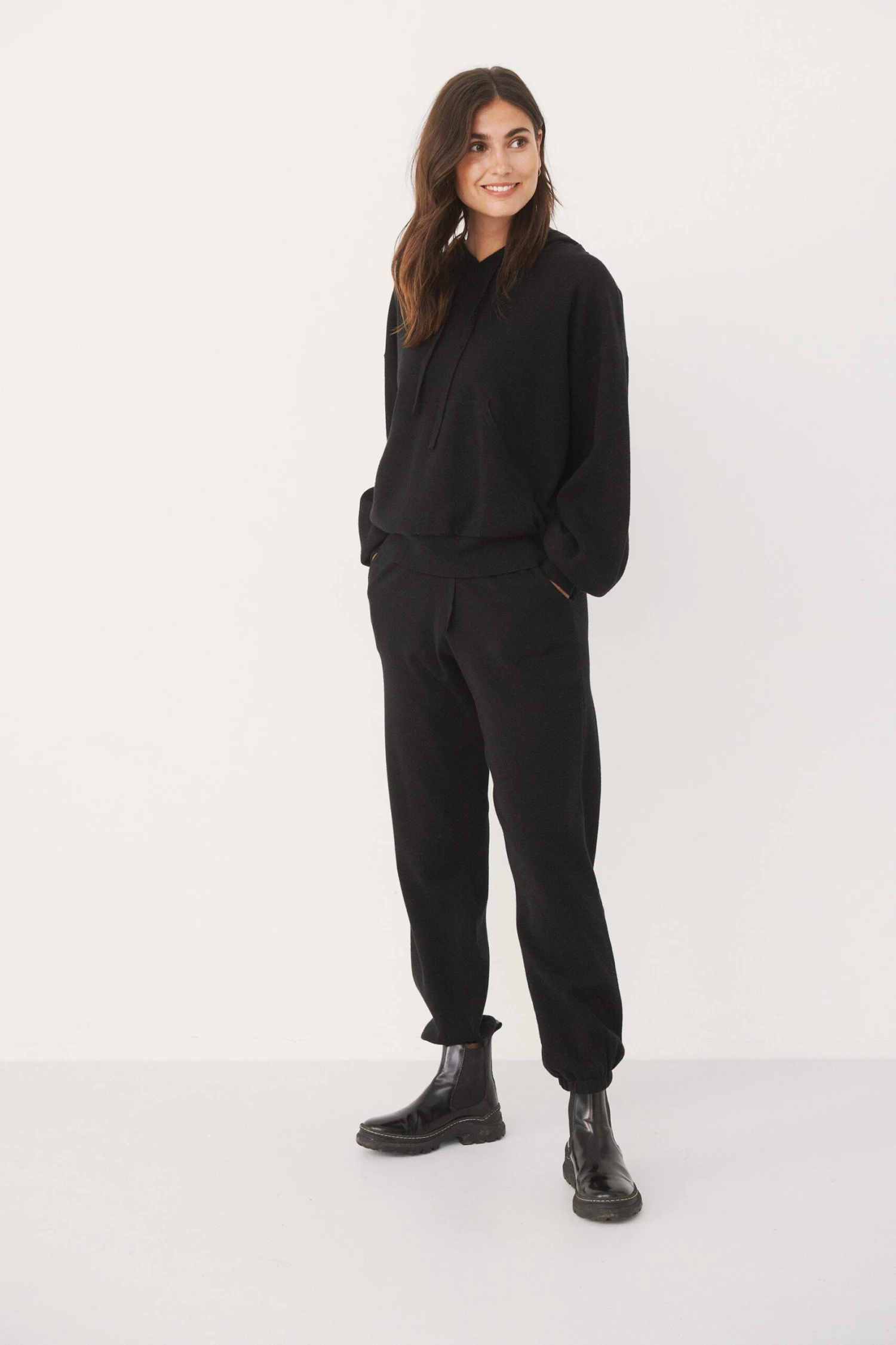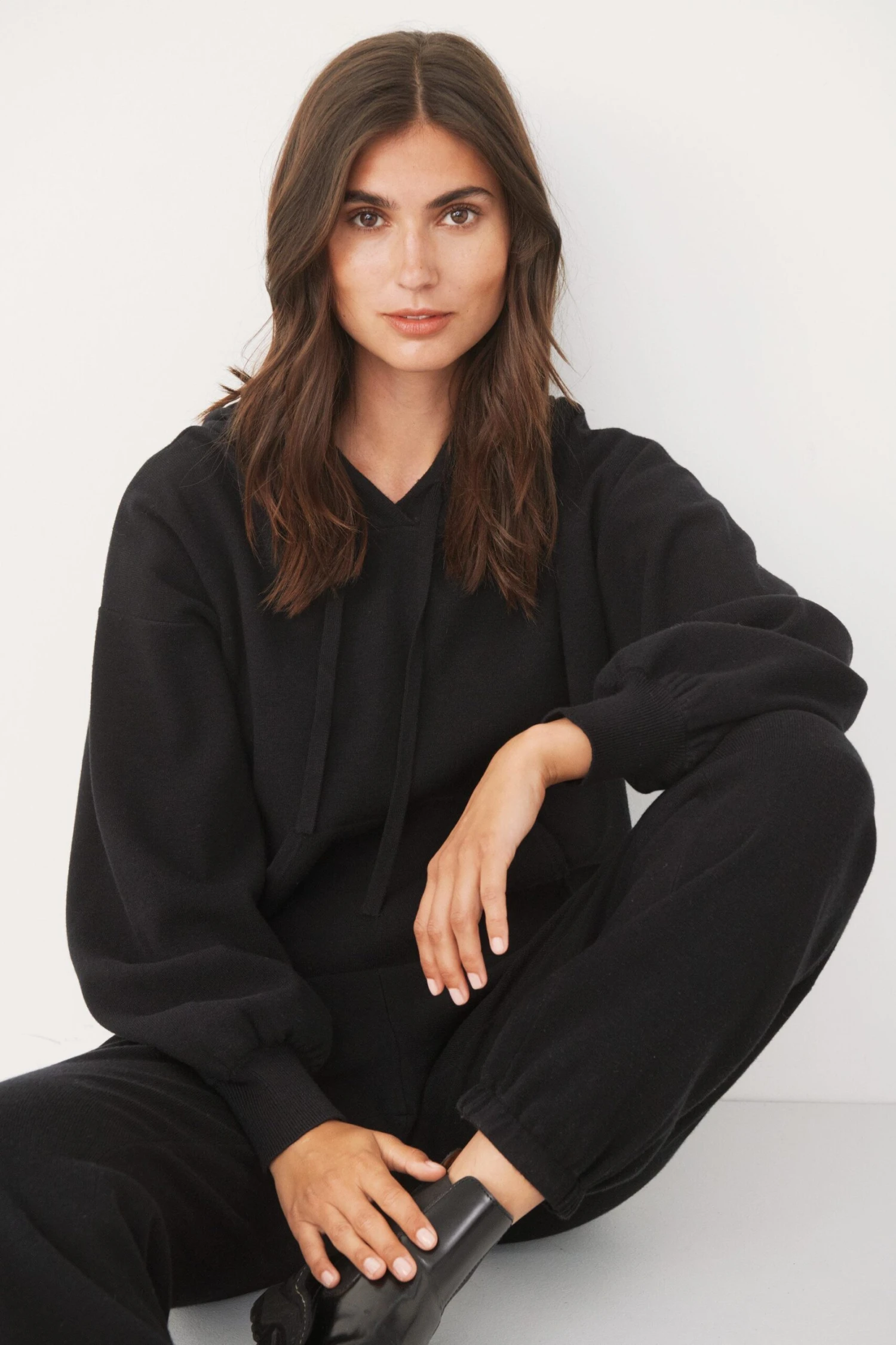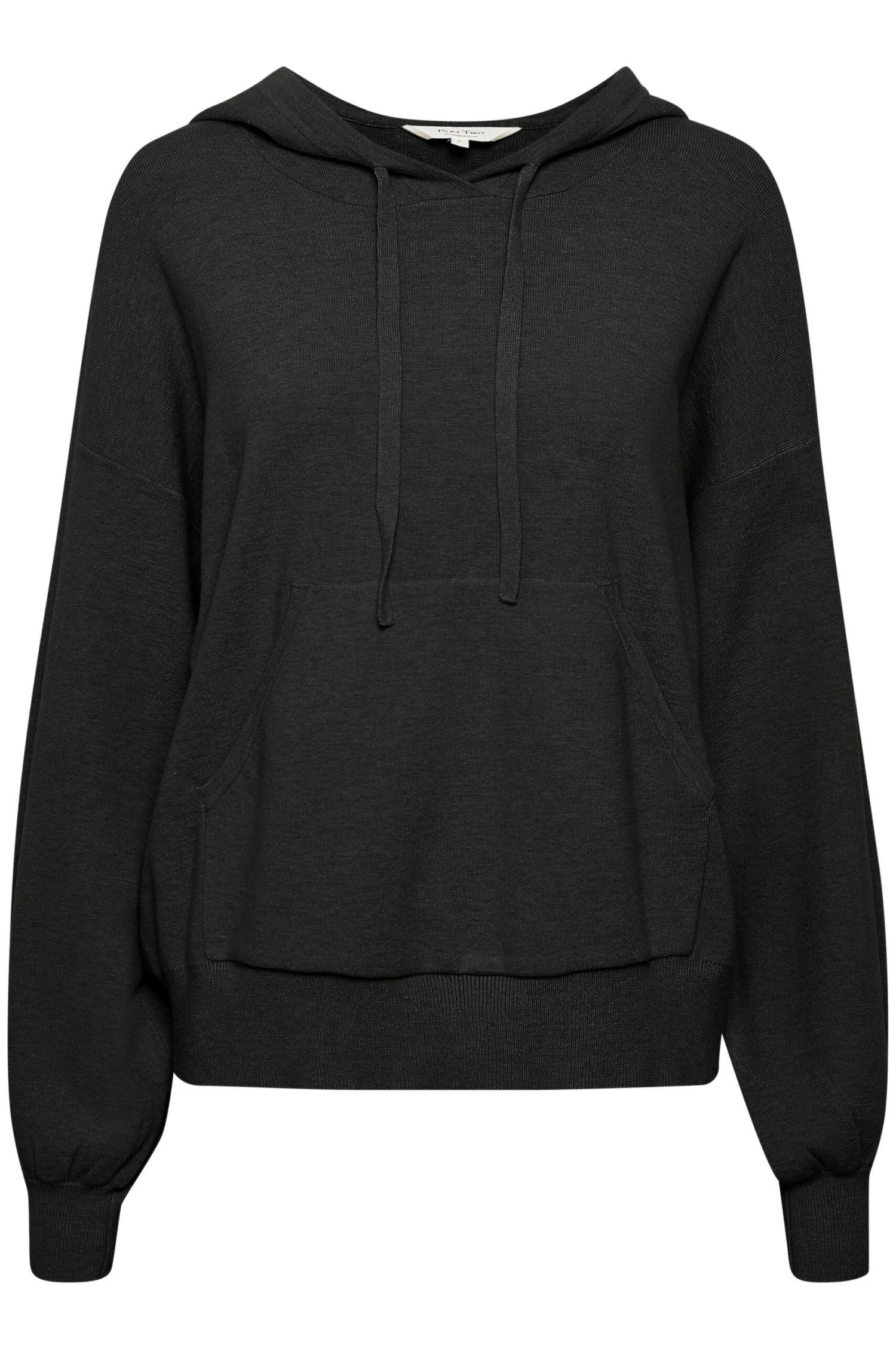 Naisten hupparimallinne neulepusero, rento väljä leikkaus. Edessä kengurutasku, leveissä hihoissa ja helmassa ribbineulokset.