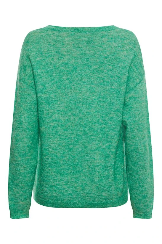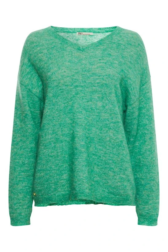 Löysä neule v-pääntiellä ja lasketuilla olkapäillä.
