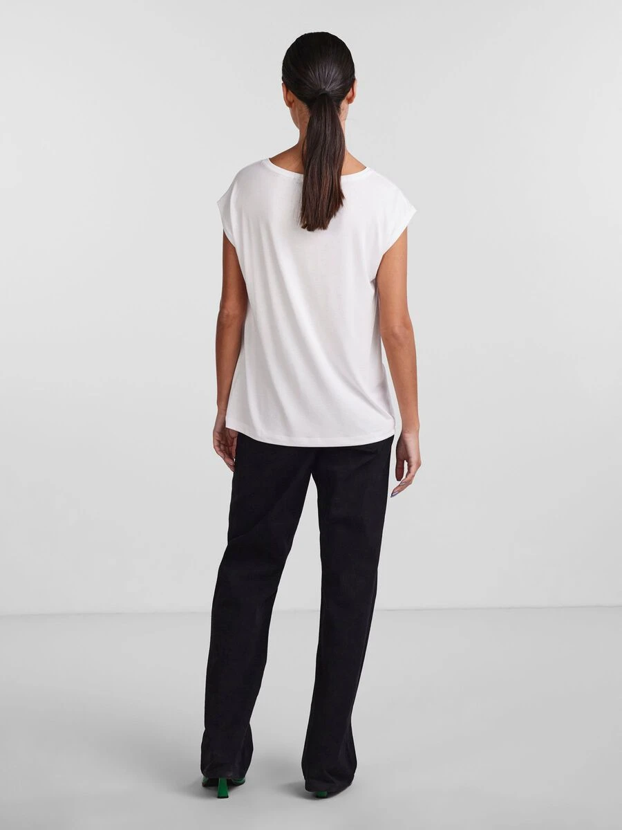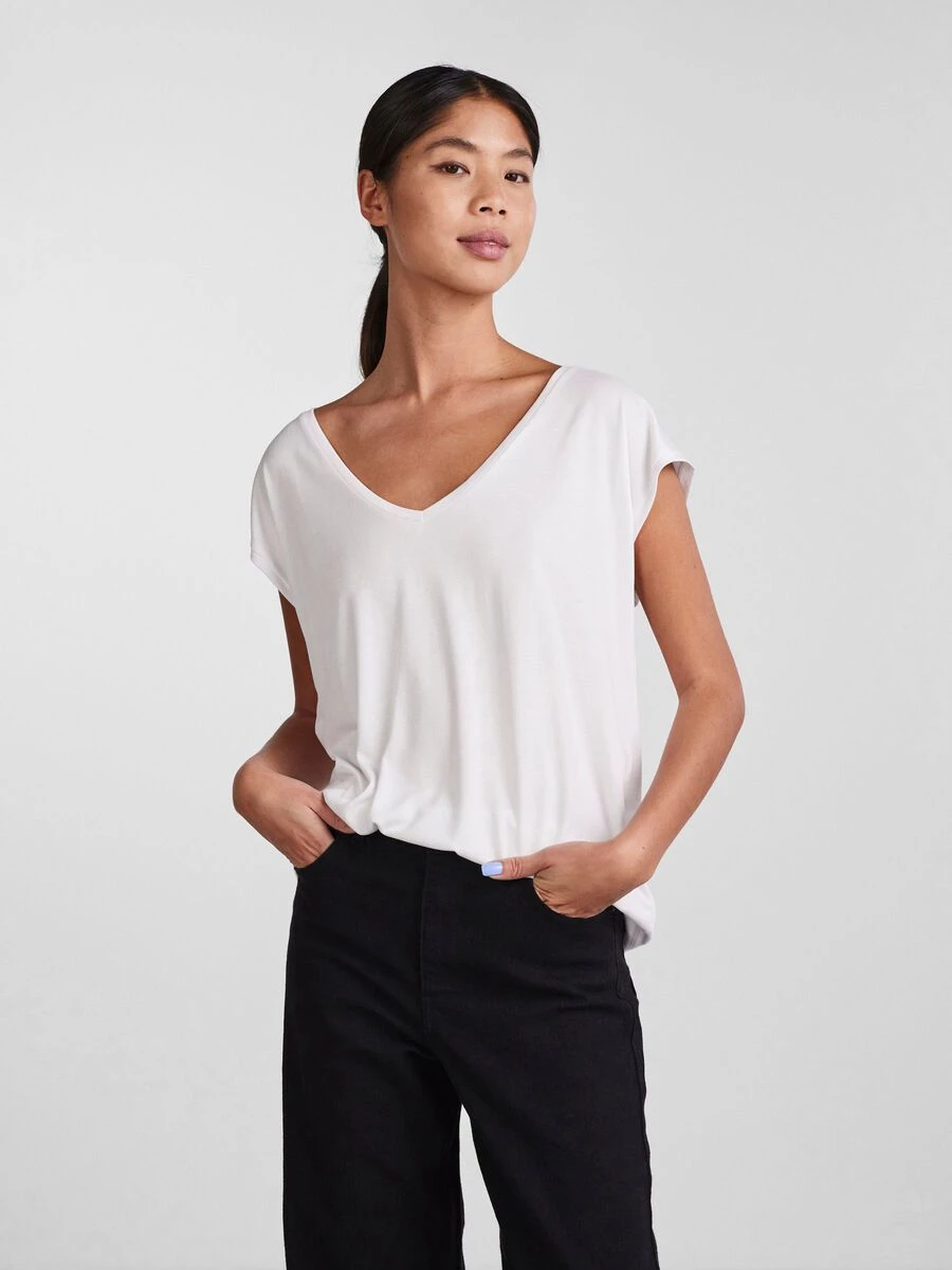 Pieces T-paidassa on joustava ja miellyttävä laatu. Pääntienä kaunis V. Suora istuvuus..