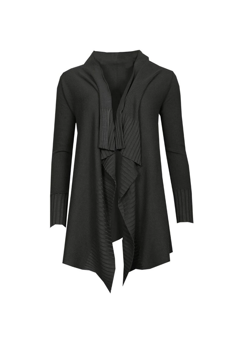 Naisten pidempi neuletakki joustavaa, poikittaista ribbineulosta. Ei kiinnitystä edessä, Pituus n.70 cm.