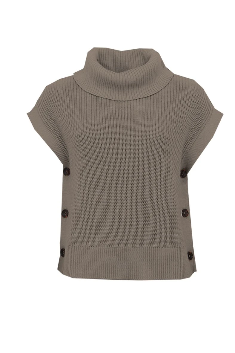 Neuleessa on väljä poolokaulus sekä koristenapit sivuilla antamassa lisänäköä.
