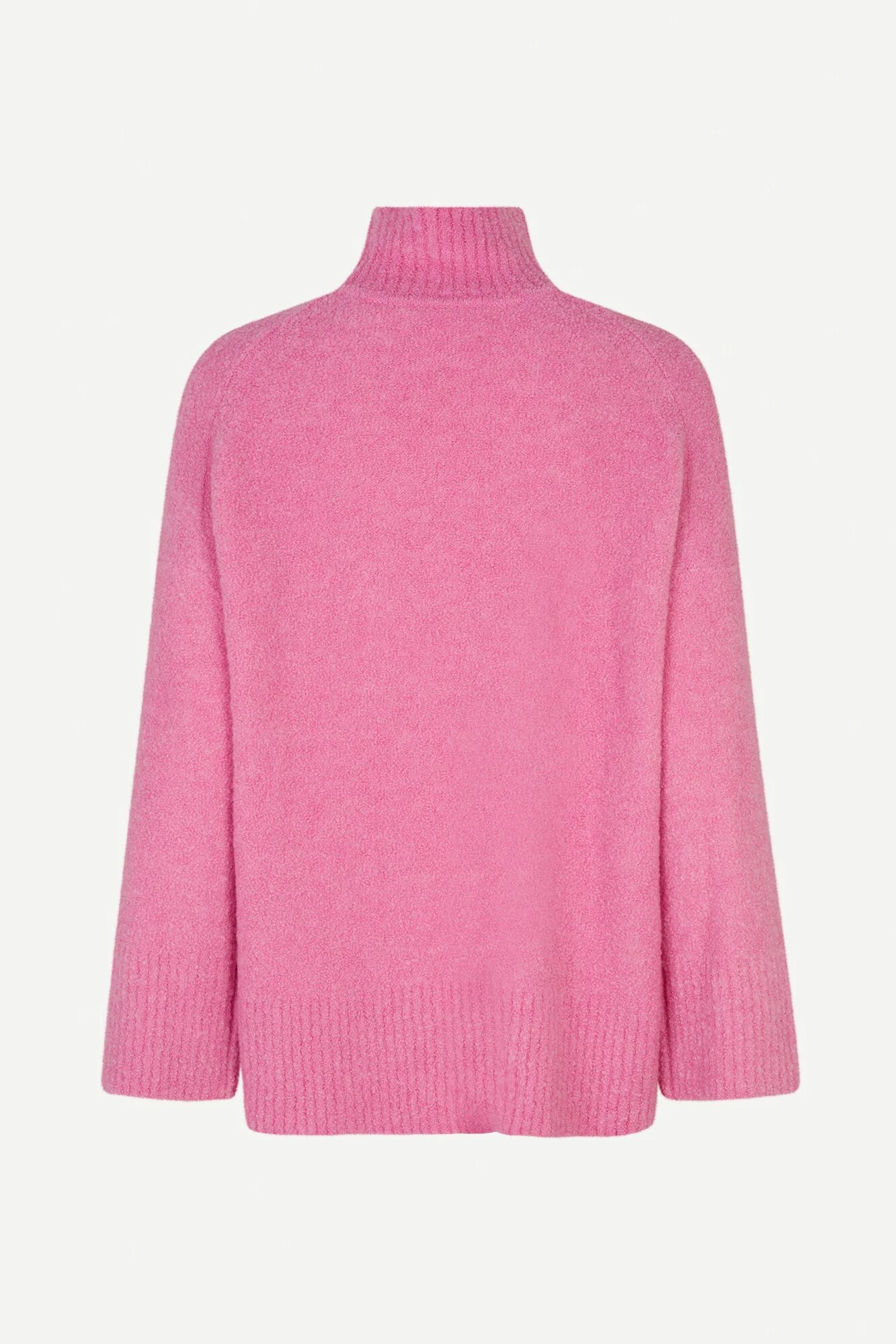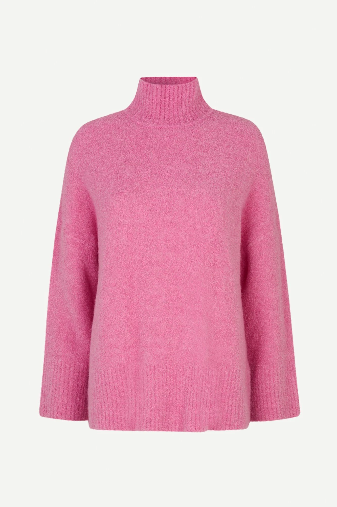 Naisten neulepaita poolokauluksella. Paidassa leveät ja pitkät hihat. Resorineule kauluksessa, hihansuissa ja helmassa.