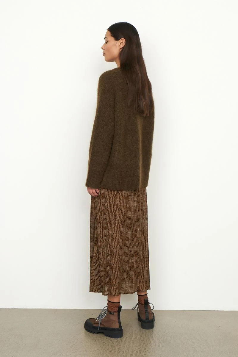 Naisten neule, pyöreä pääntie ja raglanhihat, väljä istuvuus. Pehmeässä mohairsekoiteneuleessa on pääntiellä, helmassa ja hihansuissa yksityiskohtina kontrastineulokset. Suora helma ja hihansuut.