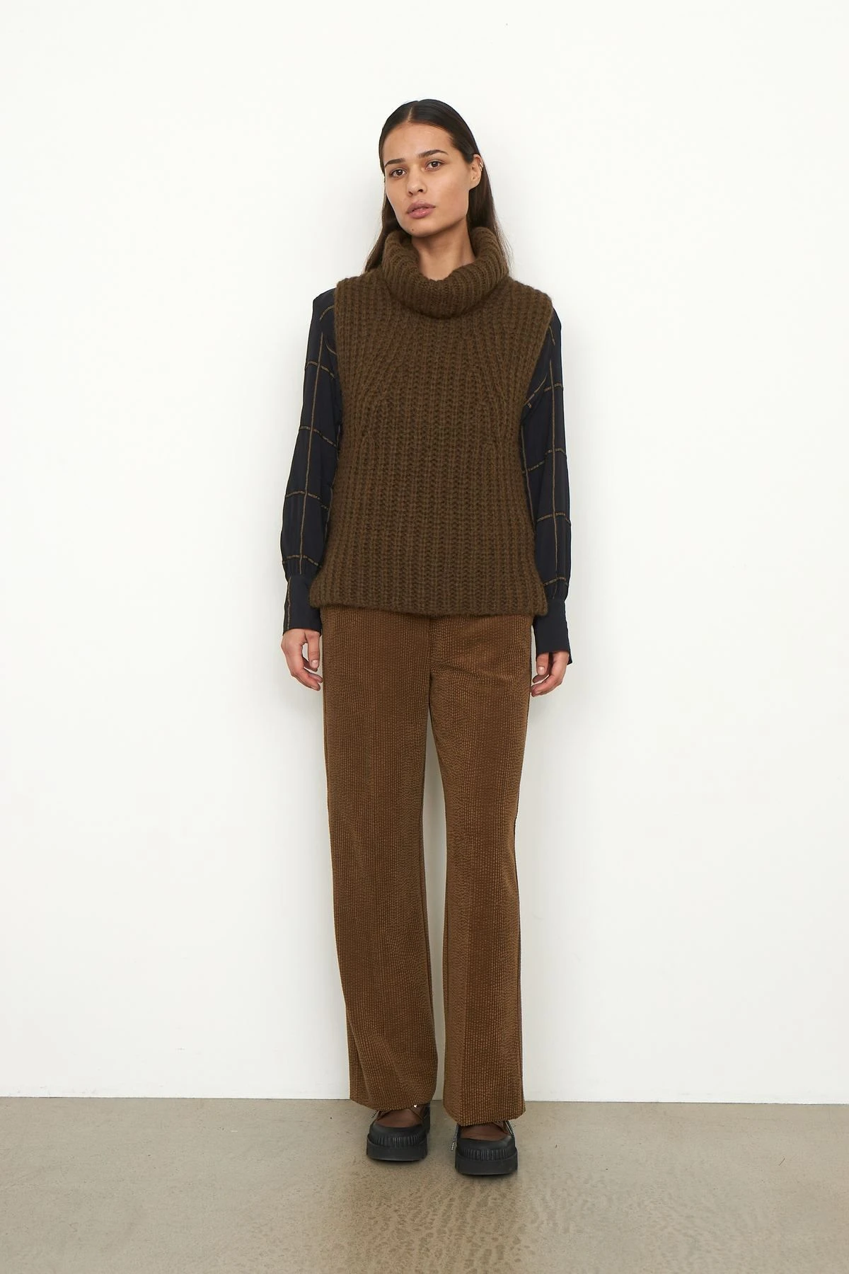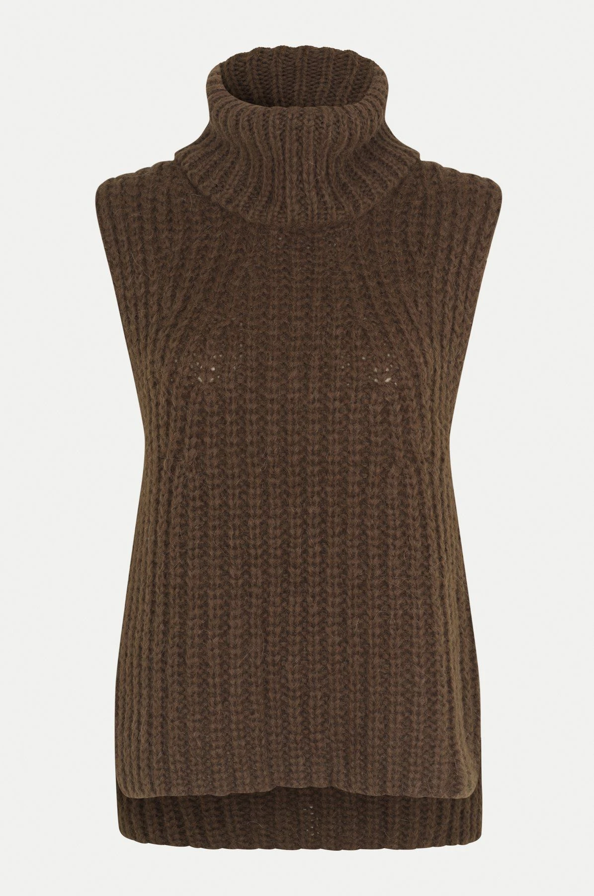 Naisten neuleliivi poolokauluksella. Pehmeä alpakkasekoite lämmittää ja tuntuu mukavalta päällä. Sopii hyvin paitisten ja trikoopaitojen päälle. Normaali istuvuus ja helma yltää lantiolle saakka.