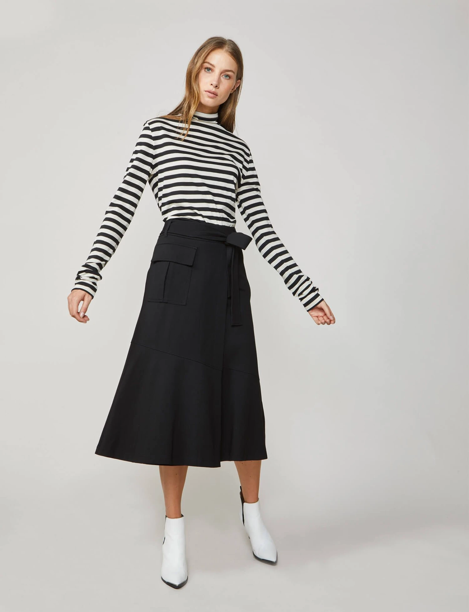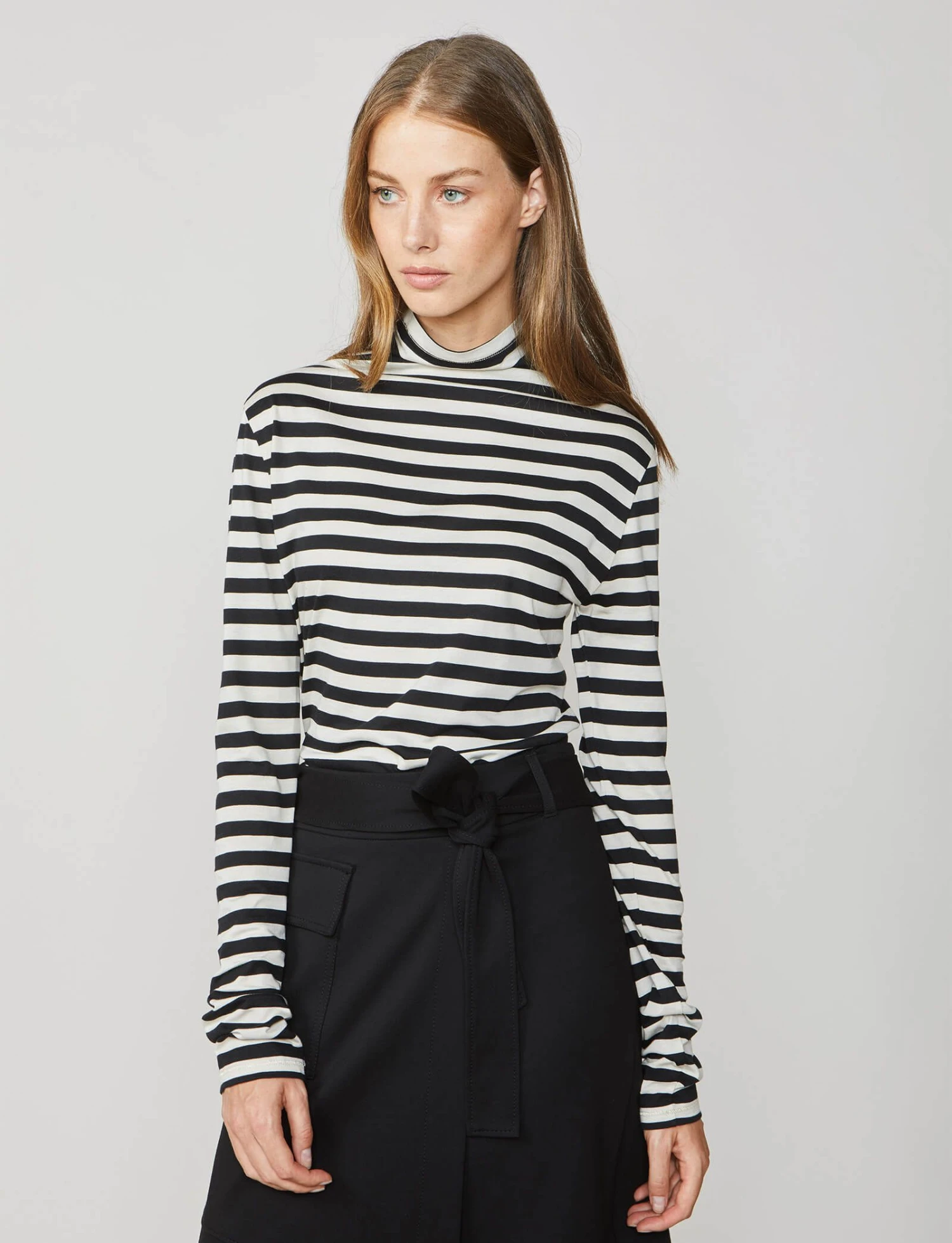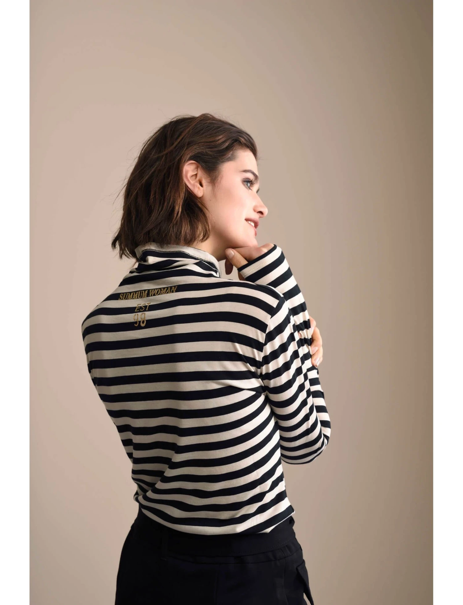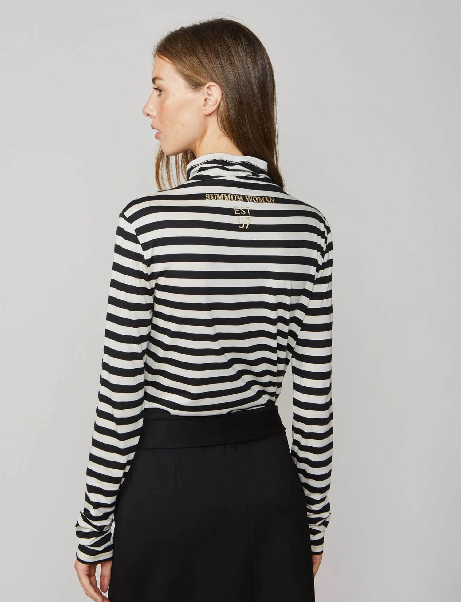 Summumin raidallinen neulepaita, jossa on korotettu kaulus. Niskassa kultaisella painatettu logo.