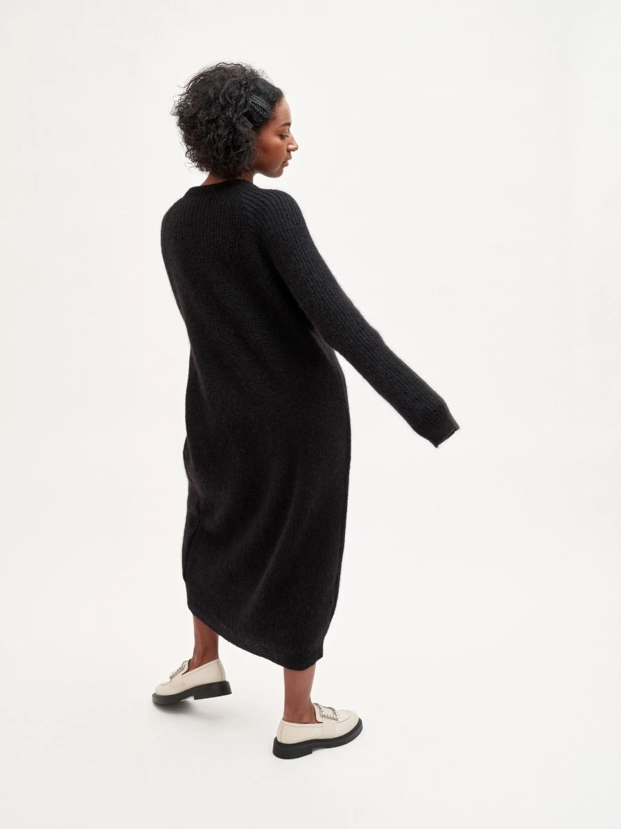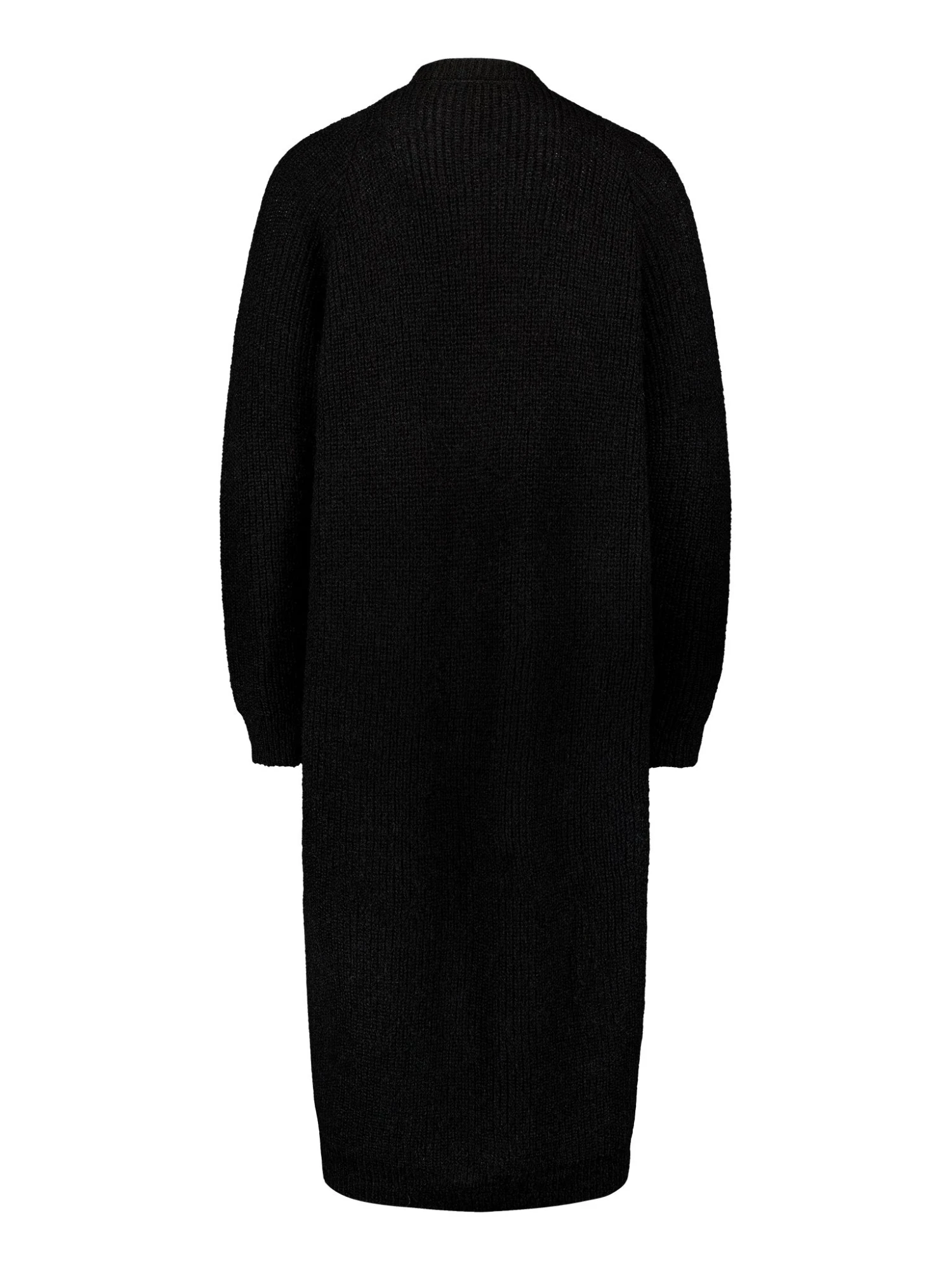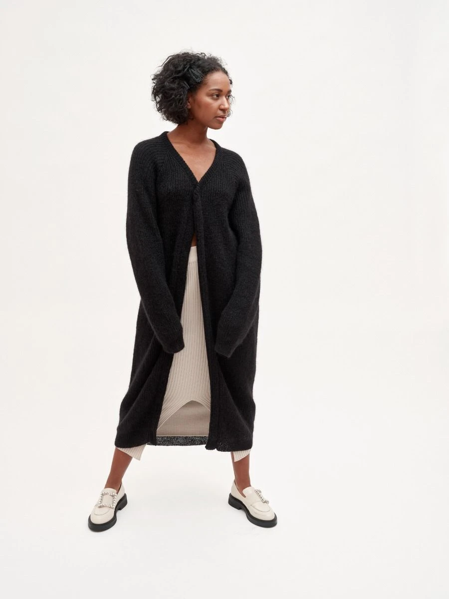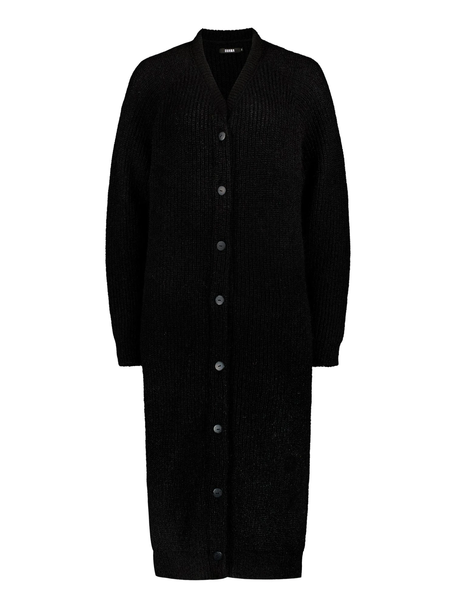 Naisten pitkä neuletakki. Neuletakissa raglan hiha ja napitus edessä ylhäältä alas. Takissa pitkät hihat.
