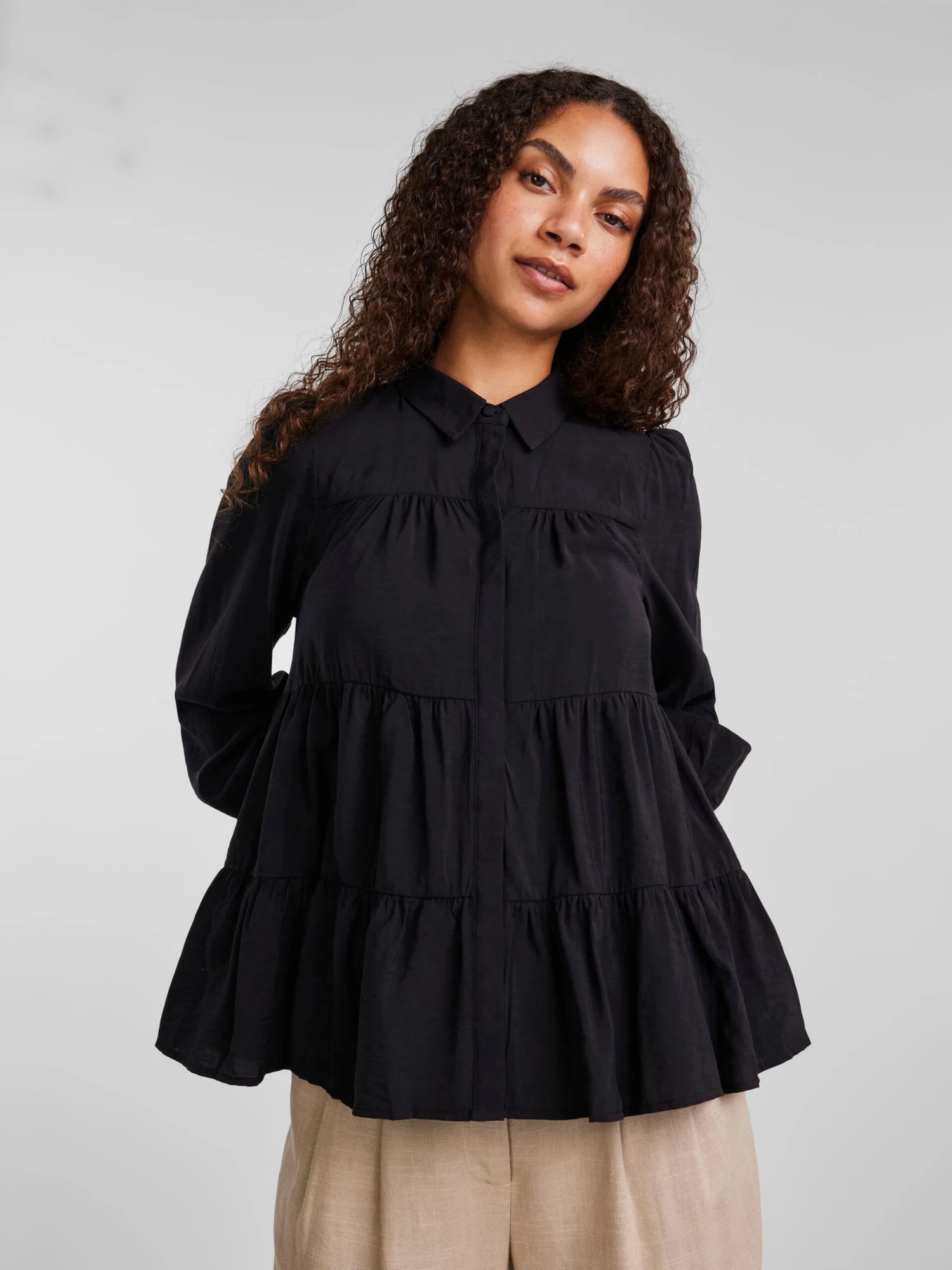 Naisten pitkähihainen pusero, helmassa rypytettyjä kerroksia. Paitakaulus, edessä piilonapitus. Olkapäillä rypytystä, hihansuissa napilliset kalvosimet.